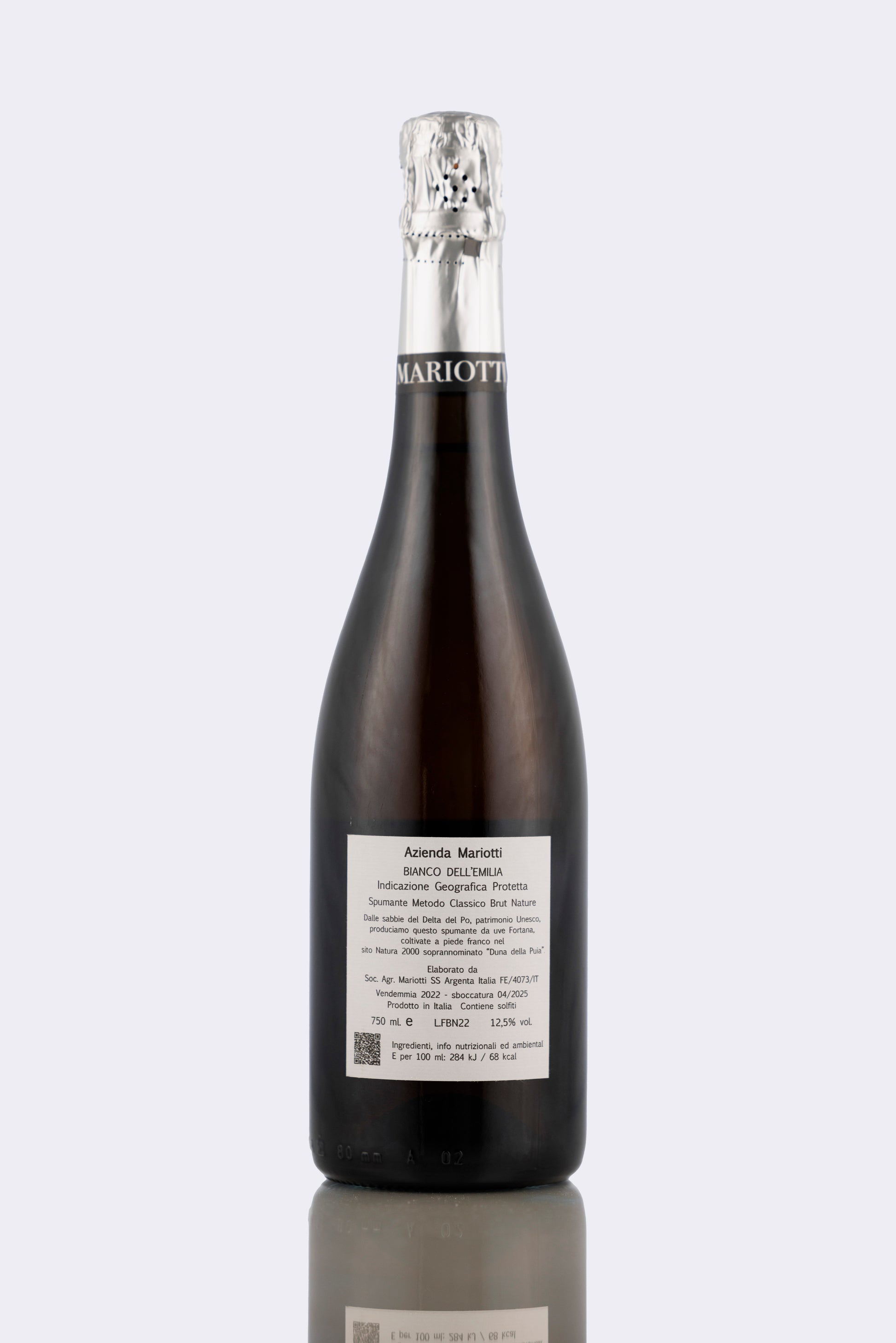 Abbatia Brut Nature 2022 Cantina Mariotti: spumante Metodo Classico da 100% Fortana, sapido e minerale, nato dalle sabbie marine del Bosco Eliceo.