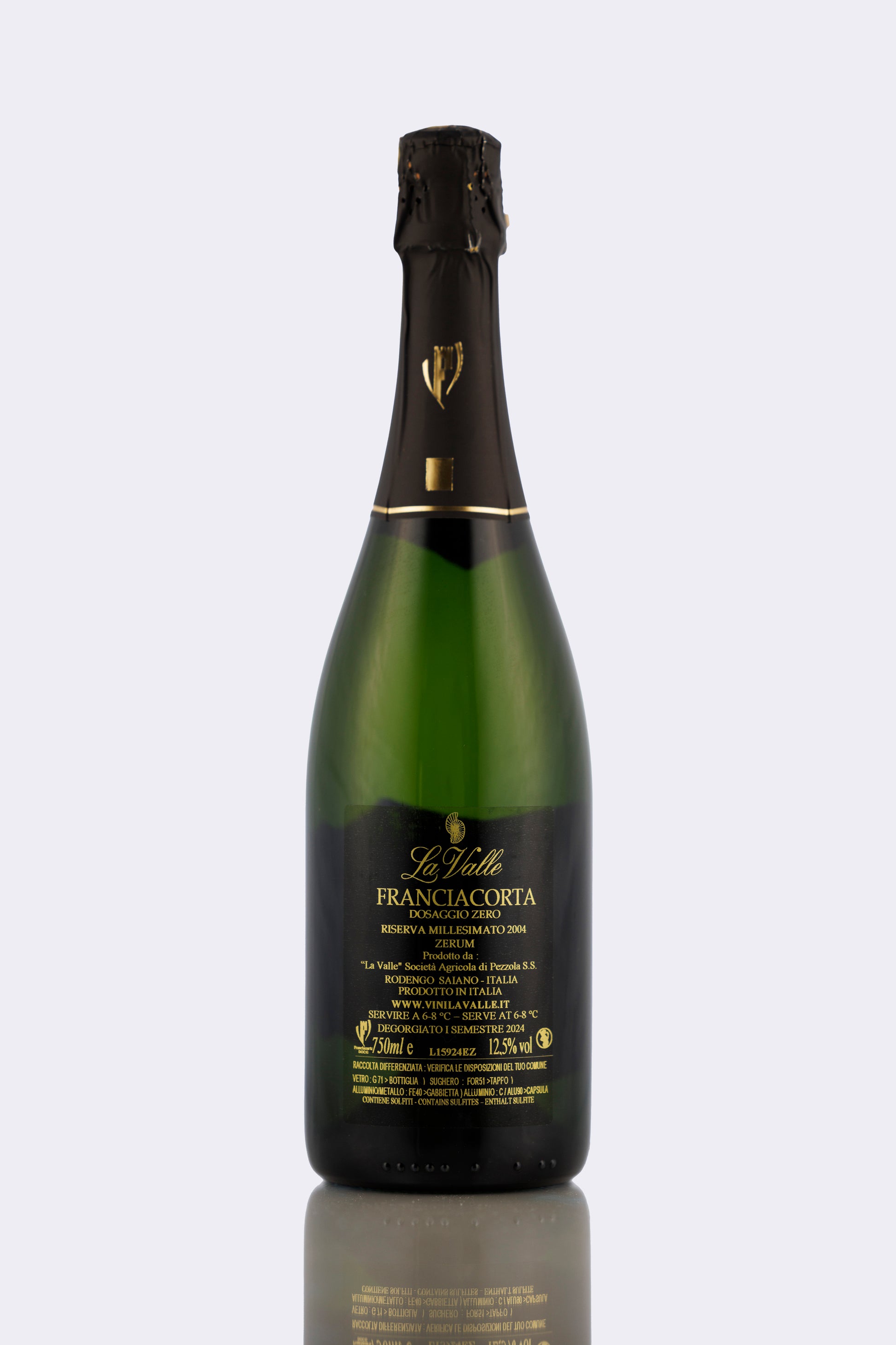 Franciacorta Riserva Zerum 2004 La Valle – Spumante Metodo Classico Dosaggio Zero, Chardonnay 100%, affinamento 7-8 anni sui lieviti. Elegante, secco e complesso, ideale per occasioni speciali.